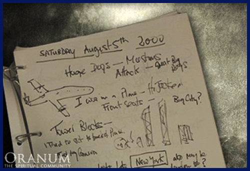 아래의 사진은 크리스 로빈슨이 꿈을 통해서 보았던 9·11테러 사건에 관한 그림인데 사진의 윗부분에 비행기가 그려져 있고 중간 우측에 세계무역센타 건물인 쌍둥이빌딩이 그려져 있다.